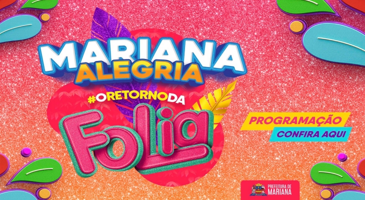 A Prefeitura Municipal de Mariana sabe que a população local esperou por muito tempo pelo tradicional “Carnaval Marianense” e hoje, depois de dois anos sem comemorações por conta da pandemia do Covid19, podemos afirmar que a folia está sim de volta! Com uma programação ampla, que agradará a todos os públicos, nossa folia se inicia …